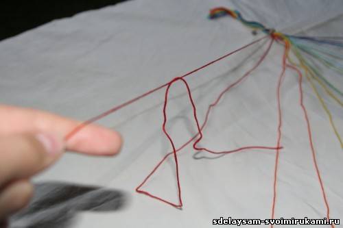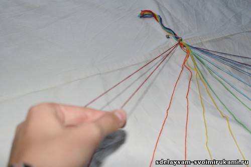 Далее раскладываем нити, как лучики, одну за другой, следя за последовательностью цветов. Плетение начинаем от левого края.