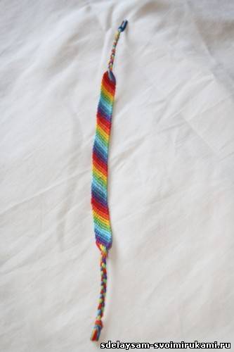 Не меняя техники, плетем также и всю фенечку, не забывая оставить в конце примерно 10 см нити для замочка.