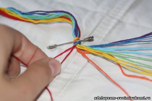 Затем раскладываем отрезанные нити, соответственно расположению цветов на радуге и аккуратно собираем их вместе, стараясь не нарушить порядок цветов.