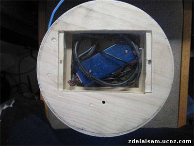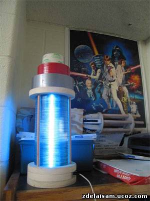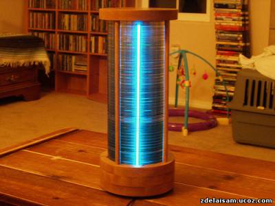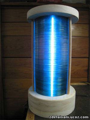 понадобится: куча старых дисков, люминесцентная лампа синего цвета, стандартный светильник для нее, из которого нужно будет взять пускатель, ну и корпус.