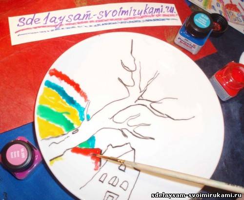 Начинаем переносить рисунок на тарелку. Для этих целей удобно воспользоваться специальным маркером для стекла, которым намечают контуры прямо на тарелке и рисуют поверх его линий. Если такого нет под рукой – не страшно, можно рисовать сразу красками, если что-то не устроит в рисунке – это легко исправить, ведь краски легко вытереть.
