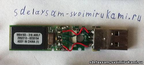 Разобрав новую флешку, я отпаял от ее платы USB разъем и установил ее в новый корпус. Она умещалась, и оставалось немного места. Примерив к этому месту, я отрезал от платы старой флешки часть с USB разъемом при помощи металлических ножниц. Аккуратно спаяв проводами контакты USB разъема старой флешки с контактными площадками платы новой флешки, я получил следующую контракцию: