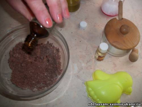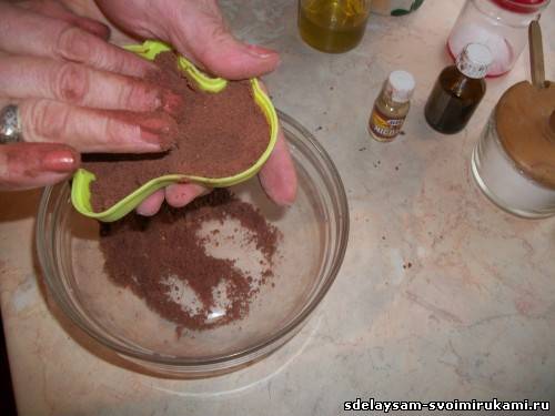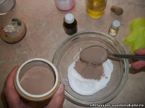 Пальцами очень хорошо перемешиваем, чтобы не было комочков. Должна получиться смесь, напоминающая песочное тесто. Затем очень плотно набиваем смесью формочку, постоянно трамбуя. Формочку можно предварительно смазать оливковым маслом, чтобы было удобнее вынимать готовую бомбочку.
