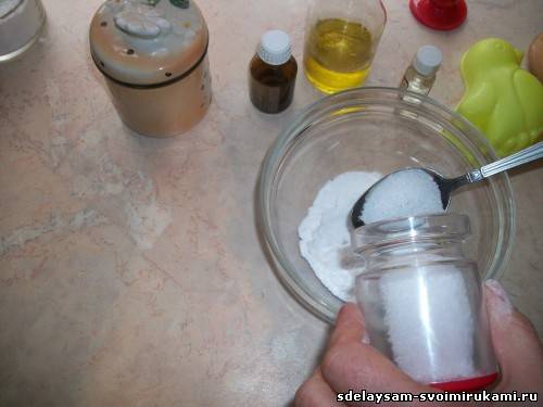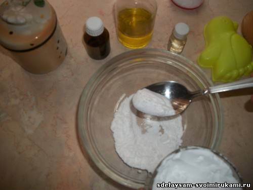 Ложкой отмеряем соду, наполнитель и лимонную кислоту. В нашем случае в качестве наполнителя была взята косметическая розовая глина. Хорошо перемешиваем сухие ингредиенты и в эту смесь добавляем масла. Сначала оливковое, потом эфирное. Мы взяли 2 вида масла: по 15 капель миндального и иланг-иланг. Миндальное масло хорошо действует на кожу, а иланг-иланг - это великолепный антидепрессант и афродизиак.