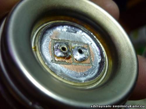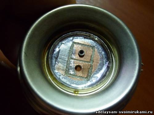 Затем из фольгированного текстолита вырезаем кусочек, размечаем его по размеру ножек лампочки, сверлим, прорезаем, пропаиваем по периметру и в конце получаем следующее: