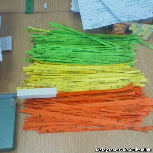 Ну да ладно, делу время. Что бы наши снежинки получились красивыми мы взяли цветные листочки формата А4. И нашинковали их вдоль шириной примерно 0,5 см. Это конечно можно сделать обычными ножницами, но у нас же массовое производство и поэтому было решено привлечь специальный нож.