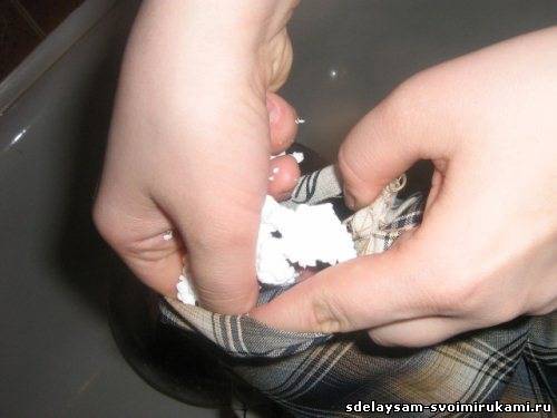 Наполняем чехол тертым пенопластом на ? объема, чтобы будущий столик мог свободно принимать нужную форму и зашиваем отверстие.
