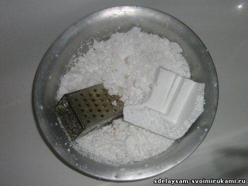 На терке натираем пенопласт. Этот этап самый трудоемкий во всем процессе изготовления. Для наполнения чехла под столик понадобится 3-4 полных таза тертого пенопласта.