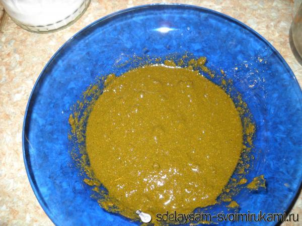2. Тонкой струйкой вливаем смесь в сухую просеянную хну, тщательно перемешивая массу.
