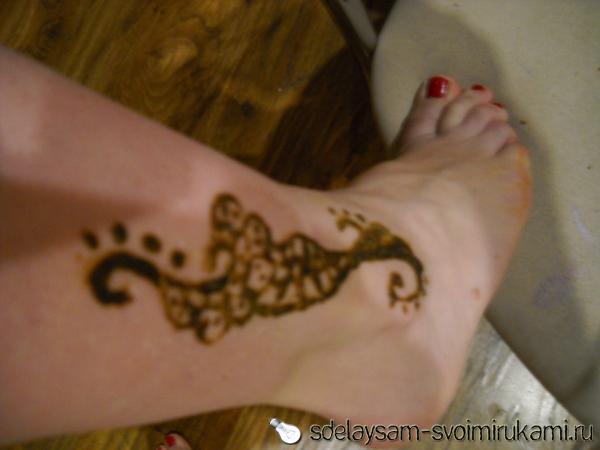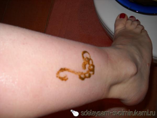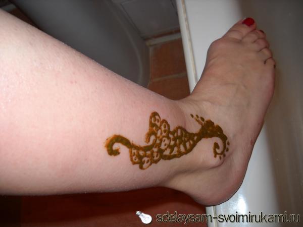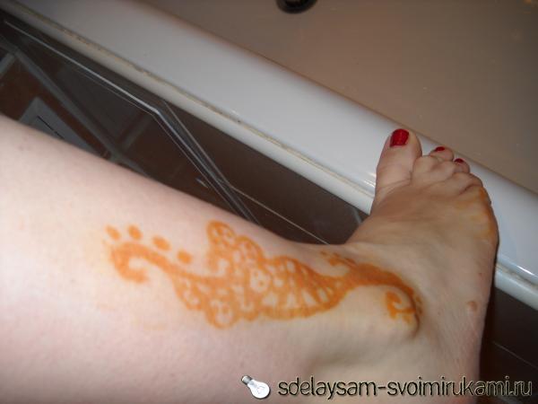 11. Рисунок должен высохнуть в течение 8 часов, старайтесь меньше двигать той частью тела, где красуется роспись, после чего излишки хны счищаются палочкой.