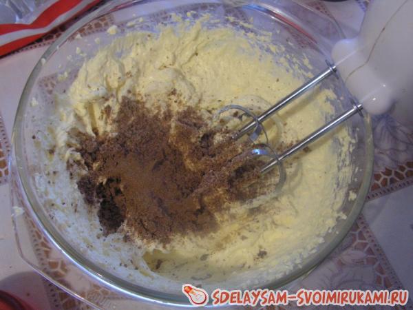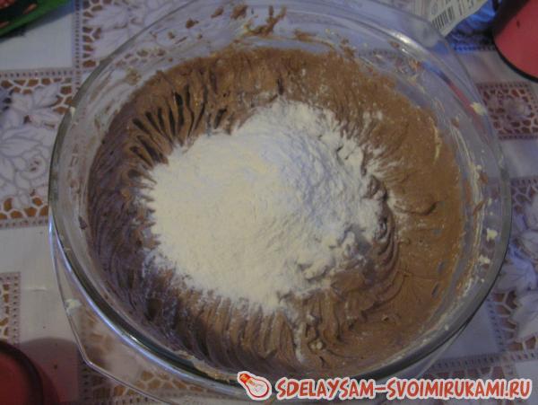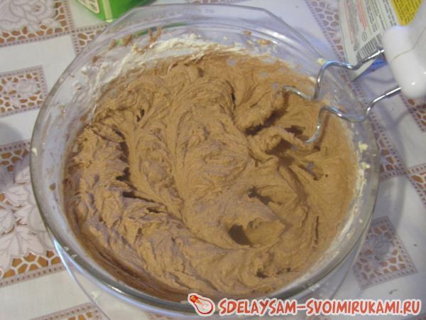 Топим шоколад до жидкого состояния, выливаем в тесто и взбиваем миксером.