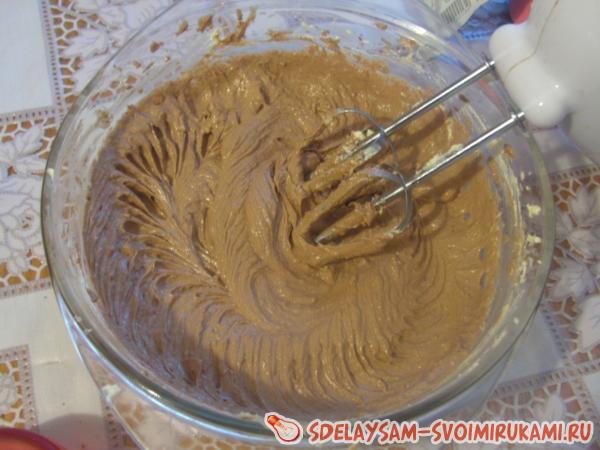 Затем добавляем яйцо и взбиваем еще примерно 5 минут. Теперь оставим наш полуфабрикат и займемся вспомогательными компонентами, в именно шоколадом, кофе и орехами. Молем орехи вместе с кофе до муки в кофемолке и все высыпаем в тесто.