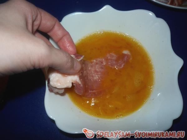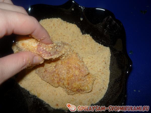 Отбитые куски свинины необходимо посолить и поперчить. Яйца взбить. Панировочные сухари насыпать на отдельную тарелочку. Каждый шницель следует обмакнуть в яйцо и в сухари. Старайтесь обваливать в сухарях так, чтобы они покрывали кусок мяса равномерно.