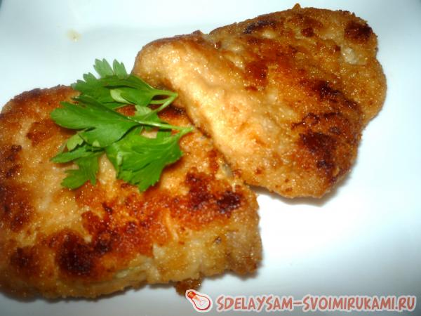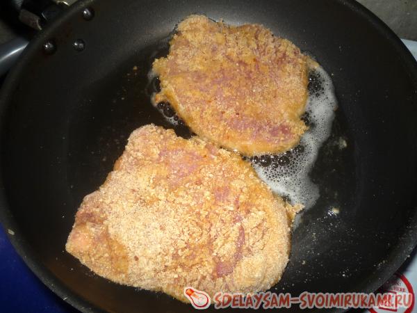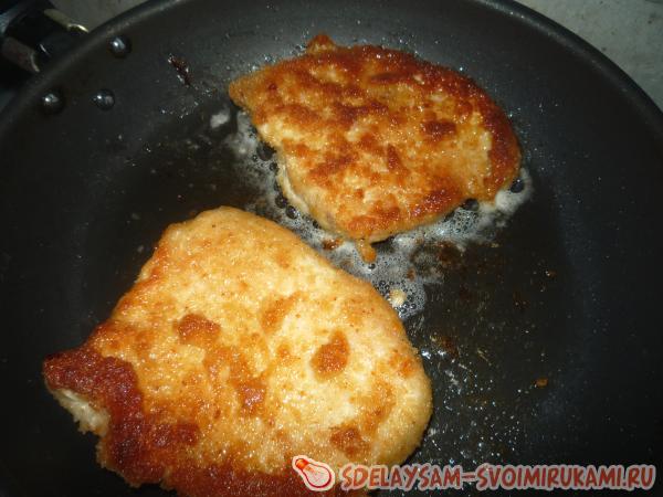 Обжарить шницели на раскаленной сковородке с большим количеством масла. Выложить готовые шницели на блюдо, покрытое бумажной салфеткой, чтобы впитался жир.