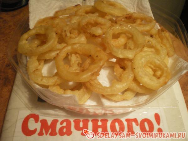 Снимаем кольца на бумажное полотенце, чтобы убрать лишний остаток подсолнечного масла. Вот луковые кольца и готовы, они хорошо подойдут как гарнир на праздничном столе, так и вечером за ужином в семейном кругу. Приятного аппетита!