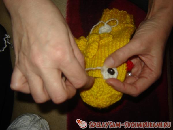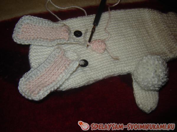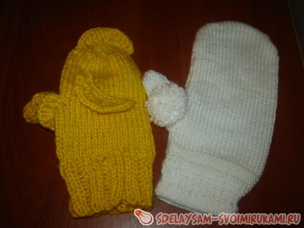 Для начала свяжите обыкновенную варежку – она и будет «туловищем» нашего героя. Вязать можно и спицами, и крючком – это не играет большой роли. Продумайте «анатомические подробности» персонажа. У нашего зайца, например, есть пушистый хвостик-бубончик, а у цыплёнка – гребешок, красный клювик и крылышки. Всё это можно вывязывать отдельно и пришивать, а можно предусмотреть при изготовлении варежки.