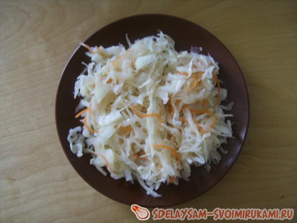 Капусту оставить на 2 дня в теплом помещении, не закрывая крышкой (можно прикрыть марлей). Поместить банку желательно в миску, так как образовавшийся сок будет вытекать. Ежедневно капусту протыкать деревянной палочкой. Через два дня можно кушать, приправив луком и растительным маслом.