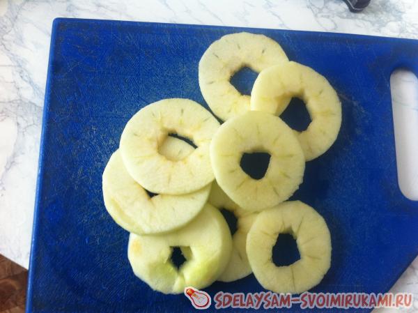 Воды должна полностью впитаться в овсяные хлопья. После чего огонь выключить, а емкость с кашей накрыть крышкой на 3 минуты. В это время почистить яблоки и порезать их кружочками. Из каждого кружочка вырезать сердцевину, как на картинки. После разрезать их пополам по линии диаметра.