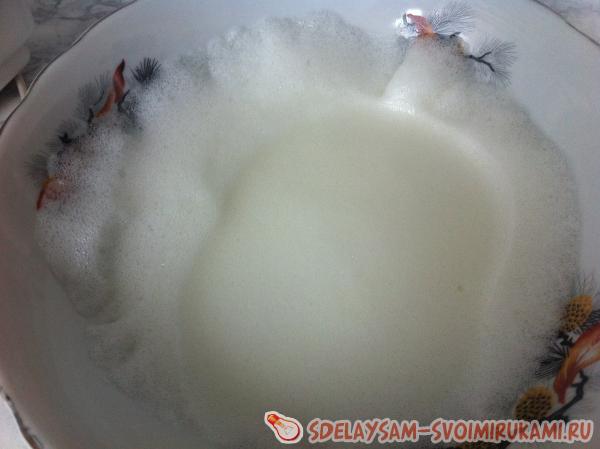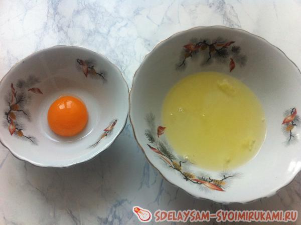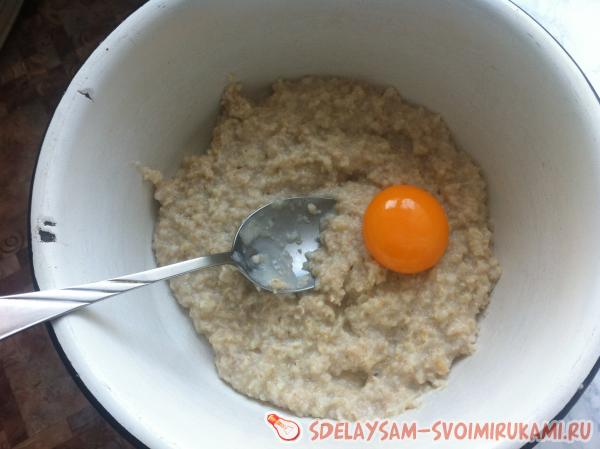 Аккуратно отделить желтки от белков. Один желток добавить к каше, перемешать. После туда же добавить муку и сахар и снова хорошо перемешать. Белки же взбить до устойчивой белой пены и аккуратными движениями сверху вниз перемешать тесто.