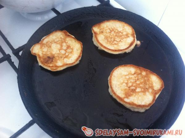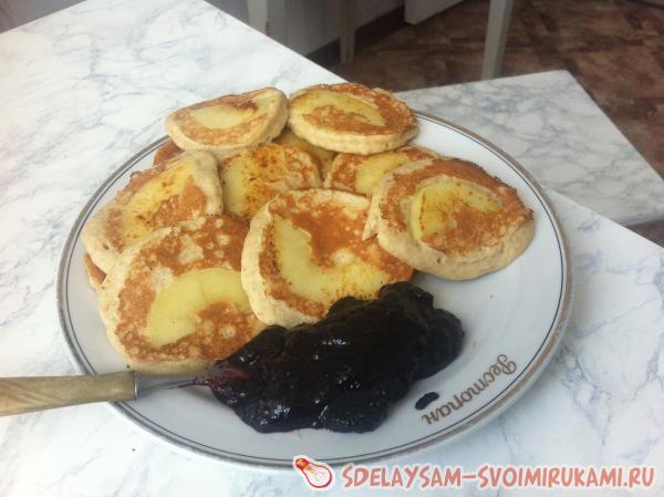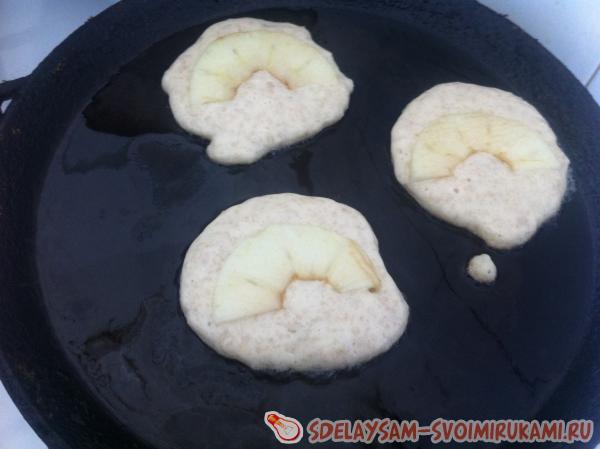 Тесто выкладывать столовой ложкой на горячую сковородку, смазанную растительным маслом. На каждую порцию теста сверху класть по половине кружочка яблока, немного вдавливая ее пальцами. Через 30 секунд оладьи переворачивать и выпекать с другой стороны еще 30 секунд.
