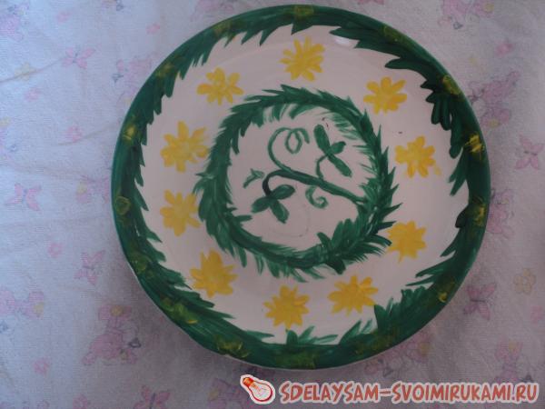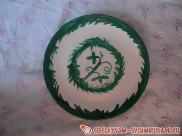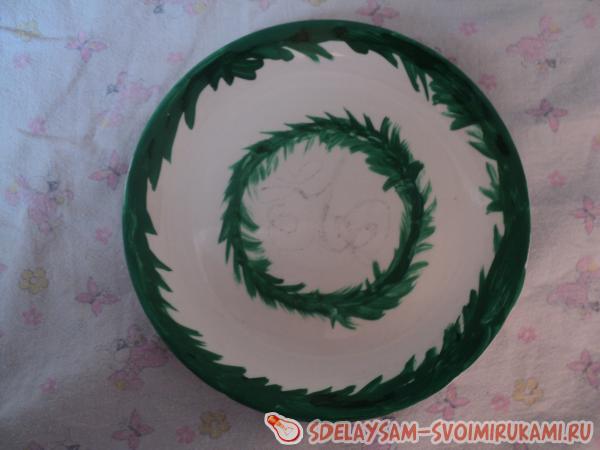 Первой стадией изготовления авторской посуды станет роспись тарелочки. Мы выбрали весеннюю тематику и украсили край блюдца неровными мазками зеленой краски. В процессе не следует смачивать кисть, так как только плотная консистенция краски позволит сохранить форму рисунка на глазированной поверхности.
