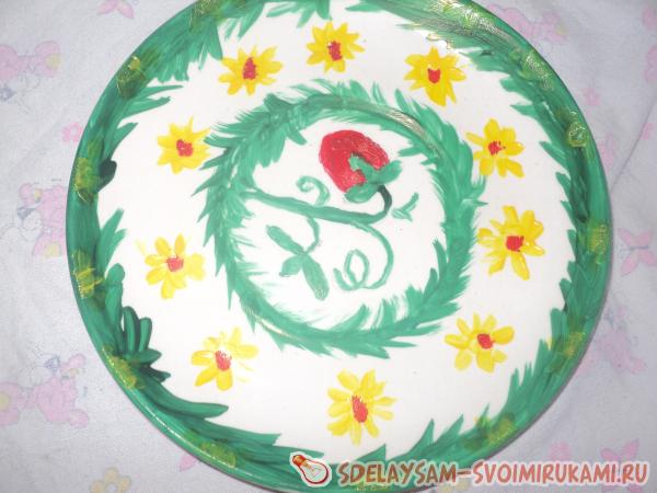 В центре блюдца мы изобразили небольшой росток с листьями, а затем добавили капли желтого цвета в виде махровых цветочков. Когда краска немного подсохла, в центре тарелочки мы изобразили ярко красную ягодку. Готовое блюдце отставили в сторону для высыхания.