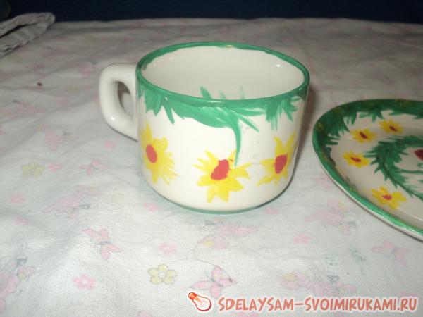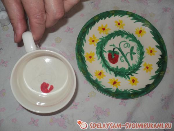 На дно кружки нанесли контур при помощи простого грифельного карандаша, а затем покрыли рисунок краской. Следует сказать, что при использовании карандаша рисунок получается ровнее. Далее насыщенным зеленым цветом выполнили ободок сверху и снизу кружки. Оттенки зеленого можно менять, добавляя немного белого или желтого цвета. В заключение, на внешнюю боковую поверхность чашки нанесли цветочки, аналогичные тем, что изображали на тарелочке.