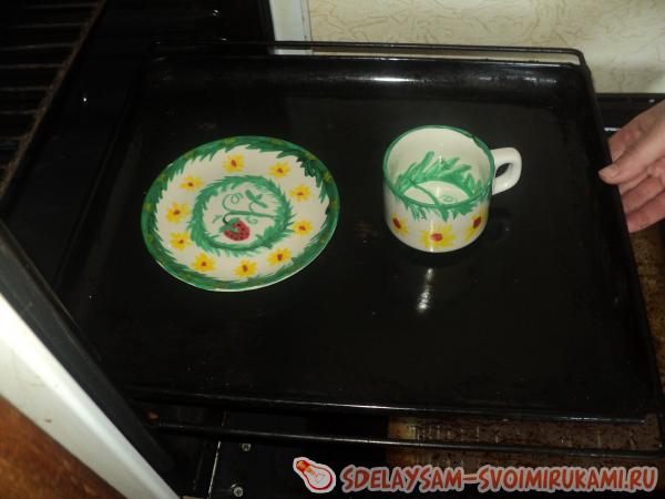 Готовую пару для закрепления рисунка отправили запекать в горячую электрическую духовку на 20 минут. Средняя температура в жарочном шкафу должна быть около двухсот градусов. Не следует увеличивать температуру, краска должна запекаться медленно. Остывать изделие должно медленно в духовке. Перед использованием чашку и блюдце моют в проточной воде с использованием любого чистящего жидкого средства.
