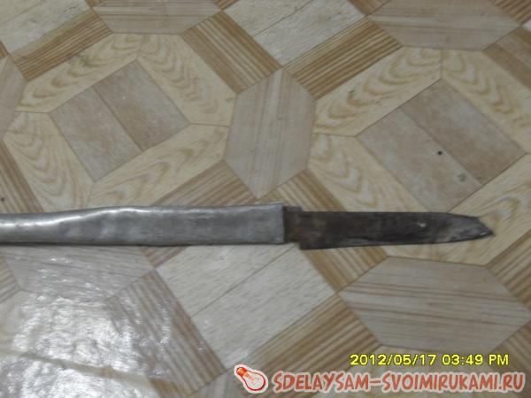Сперва надо взять нож. Если на его ручке имеются деревянные или пластиковые накладки, то их нужно взять, чтобы осталась только металлическая часть. В моем случае нож был уже без них. Далее надо попробовать засунуть заднюю часть в трубу. Если она влезает, то все хорошо. Если как у меня она не влезает, то молотком аккуратно сминаем трубу на длину задней части ножа. После этого вставляем нож. Далее засовываем в щели между трубой и ножом вату. Это нужно для уплотнения. Засовывать нужно очень туго, иначе нож будет мотаться и может выпасть. Далее молотком сплющиваем трубу, чтобы окончательно зафиксировать нож. Внимание! Сплющивать надо не всю трубу, а только у вставленной части ножа.
