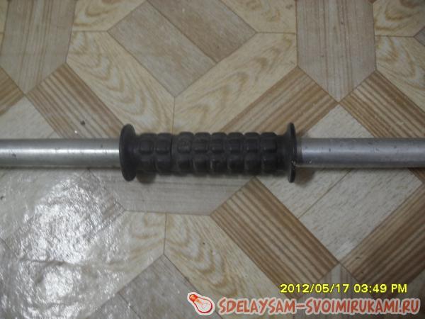 Для того чтобы копье летело прямо, и его было легко кидать, надо сделать несколько простых шагов. Сперва уравновешиваем его на пальце, и помечаем это место. Далее понадобятся 2 накладки на руль велосипеда. Накладки нужны резиновые, и желательно по размеру трубы. Далее надо срезать ту часть накладки, которая не имеет выступа. Выступ – то место где при езде на велосипеде находится мизинец. Тоже самое делаем со второй накладкой. Потом их обе надеваем на трубу, в то самое помеченное место. Все, готово.
