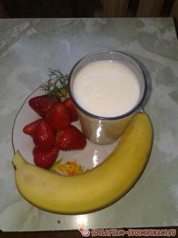 Нам нужны фрукты: бананы, клубника, черника, малина и абрикосы. Вообще, можно добавлять и другие ягоды. Все очень просто. Фрукты мелко нарезаем и добавляем в кефир, желательно жирный, и все перемешиваем. Наш удивительный и вкусный йогурт готов.