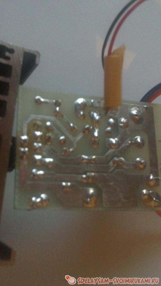 Теперь нам необходимо сделать разводку, которую проще всего сделать в программе sprint layout. После того, как разводка готова печатаем на фотобумаге нашу разводку (принтер обязательно должен быть лазерным!). После чего накладываем напечатанный фрагмент на нашу плату и в течение 5-10 мин гладим утюгом. Затем опускаем под воду и легкими движениями счищаем бумагу. Теперь нам необходимо протравить плату. Для этого берем хлорное железо и добавляем его в слегка подогретую воду и окунаем туда плату (ни в кое случае не используйте посуду, предназначенную для приёма пищи!) Процесс травления занимает от 10 мин до 5-8 часов, все зависит от количества раствора и температуры воды. После того, как плата протравилась счищаем слой краски, в результате чего наши дорожки станут медными. Теперь нам осталось припаять элементы. Для начала просверлим отверстия под наши элементы, после чего дорожки рекомендуется смазать флюсом. После это по схеме вставляем все элементы и припаиваем их. На этом наша работа переходит в завершающую стадию, проверка на работоспособность.