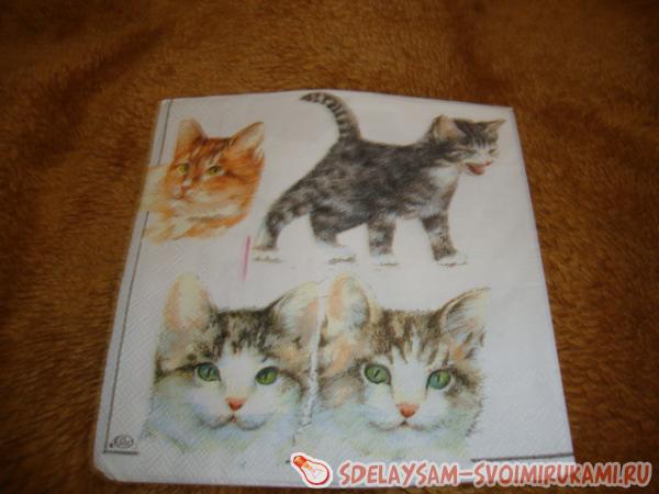 Зная эти тонкости, можно за десять минут создать неповторимую вещь. Сегодня продаются салфетки с различными орнаментами, флористическими и морскими мотивами, часто изображаются различные животные, на некоторых салфетках красуются портреты красавиц в стиле ретро. При помощи предметов обихода, декорированных таким образом, можно даже создать интерьер в стиле ретро или в этническом стиле.