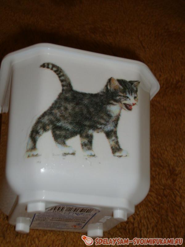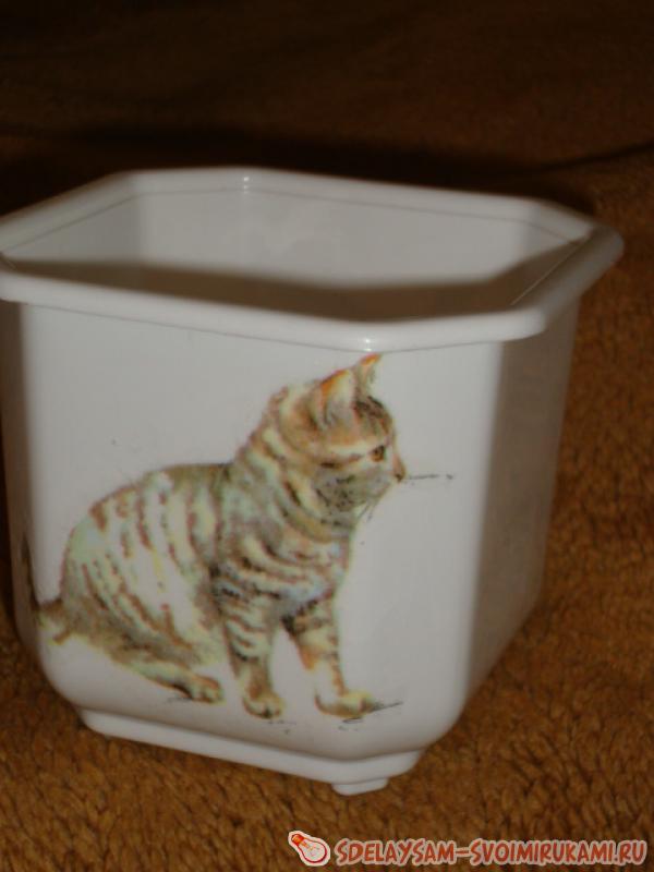 Овладеть этой техникой под силу любому. Декупаж не требует особых навыков. Достаточно вырвать кусочек салфетки, на котором отображен рисунок. Желательно, чтобы изображение было на белом фоне. После этого следует отделить цветной слой салфетки. Именно его нужно приклеить, например, на цветочный горшок. Чтобы достичь желаемого эффекта, достаточно придерживаться несложных правил: не набирать слишком много клея на кисточку (можно размочить и порвать салфетку), разглаживать салфетку кисточкой от центра к краям (если сразу приклеить края, могут образоваться складки), отчетливее всего рисунок будет смотреться на белом фоне.