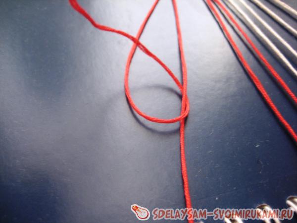• Начинаем плести с левого края. Берем крайнюю нить и проводим ее над соседней правой нитью. Далее делаем петлю, как на фото