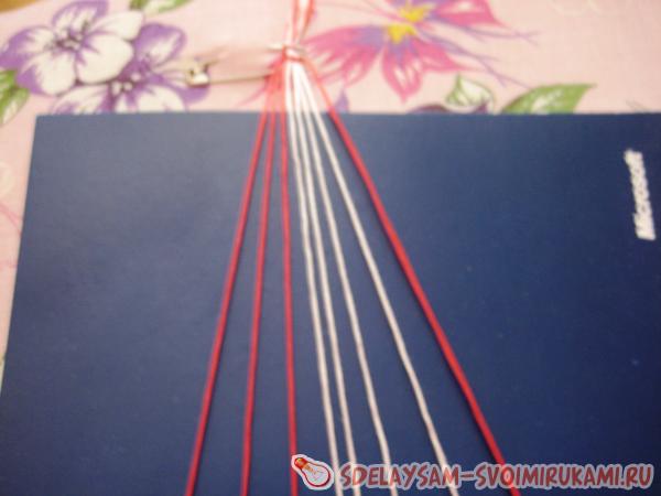 • Нарезаем нити длиной около 50 сантиметров. Получается восемь нитей, по четыре на каждый цвет