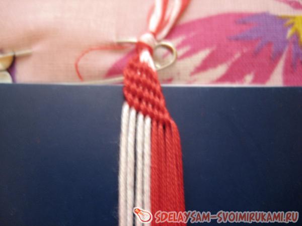 • Дальше делаем также по два узла на оставшихся нитях в порядке их следования. Внимание, узелки делаются одной и той же (крайней левой) нитью, которой мы начали плести с самого начала. В результате она станет крайней правой
