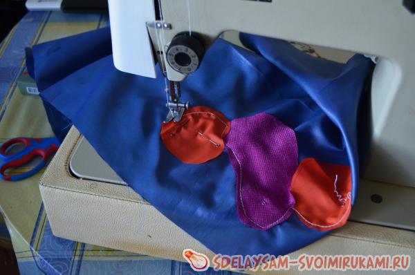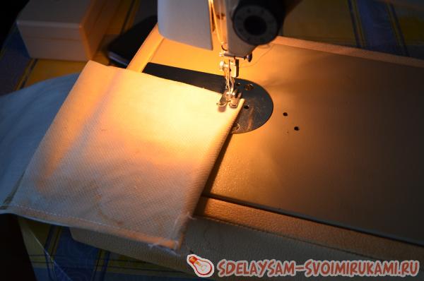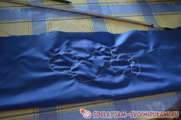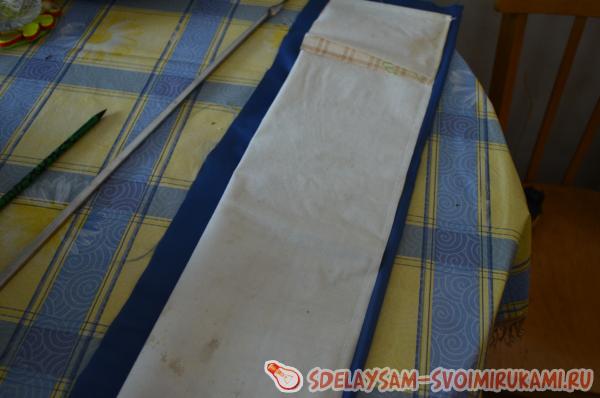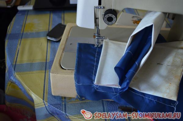 Выбрав ткань, надо раскроить форму. На отрезе внешнего чехла формируется отделка и пришивается руками, швейной машинкой. Кому как нравится. Застрачивается с трех сторон.