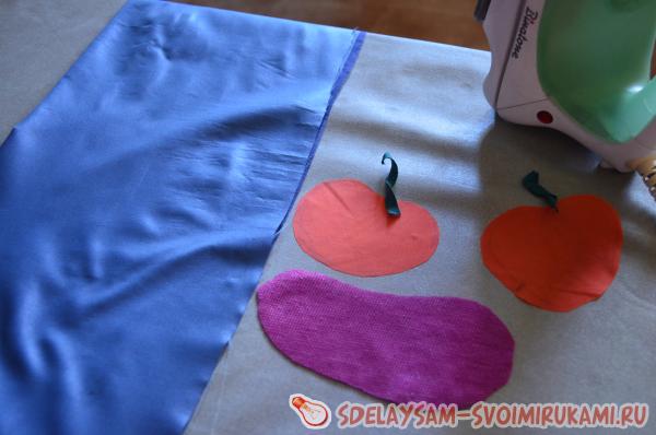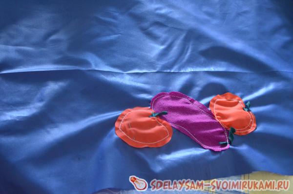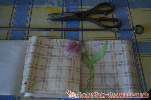 Для работы надо приготовить материал для внешней отделки – желательно крепкий, плотный. Внутренняя часть выполняется из столовой клеенки – она не пропускает влагу, хорошо моется, не разорвется от острых концов шампуров. Для оформления чехла можно выбрать любой сюжет – это могут быть овощи на блюде, красивый поварской колпак, стилизованная свинка, или барашек. Проявить фантазию в этом деле совсем не сложно.