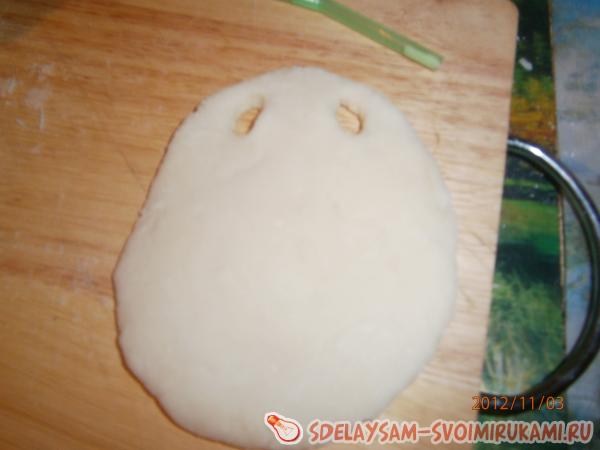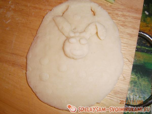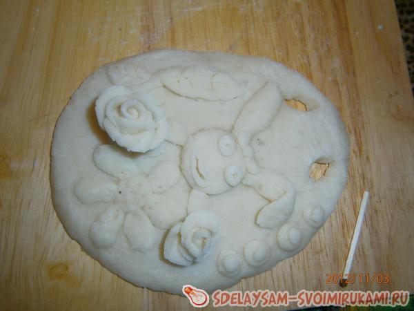 Я взяла небольшой кусочек теста и раскатала его до необходимой формы. Затем сверху проколола две дырочки трубочкой. После этого приступила к созданию картинки. Приклеила голову и уши зайчику. Потом слепила розочки и ромашку. Приклеила их.
