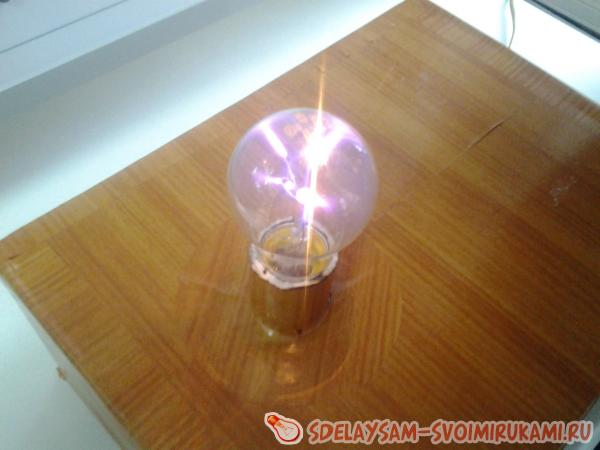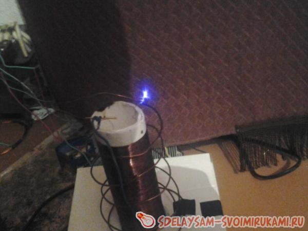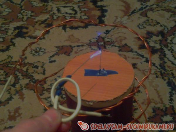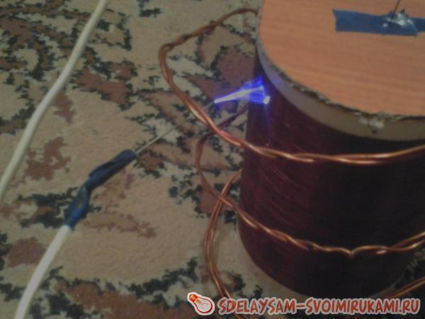 Берем трубку из картона и мотаем вторичную обмотку виток к виточку проволоку (0,15-0,25) периодически заливая лаком. Это самая кропотливая работа. Чем больше витков, тем лучше конечный результат. Теперь вокруг вторичной обмотки делаем 3-4 витка более толстым проводом (проволокой, пластиной) толщина (ширина) которой должна быть 1-4 мм. Далее подключаем эти 2-е обмотки к схеме и включаем это устройство в сеть. И что мы видим? При поднесении к данному прибору люминесцентной лампа она горит без проводов… Мы можем проводить электричество через тело не навредив ни одному органу, для этого достаточно поднести руку к к вторичной обмотке а второй рукой схватиться плотно к одному из контактов люминесцентной лампы…
