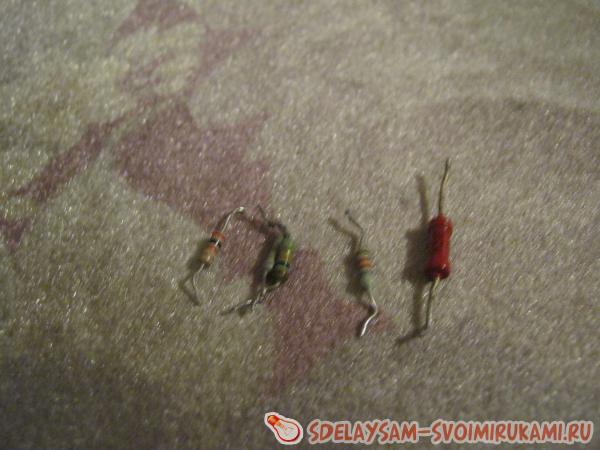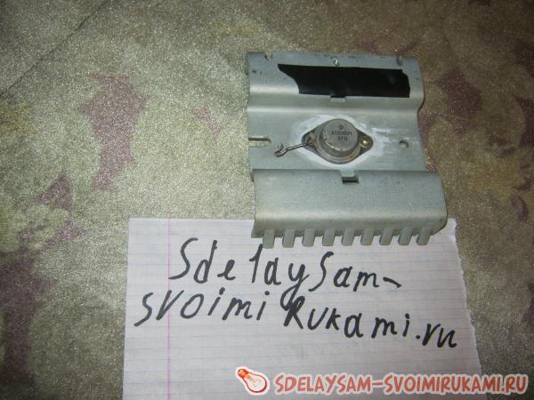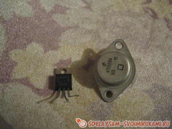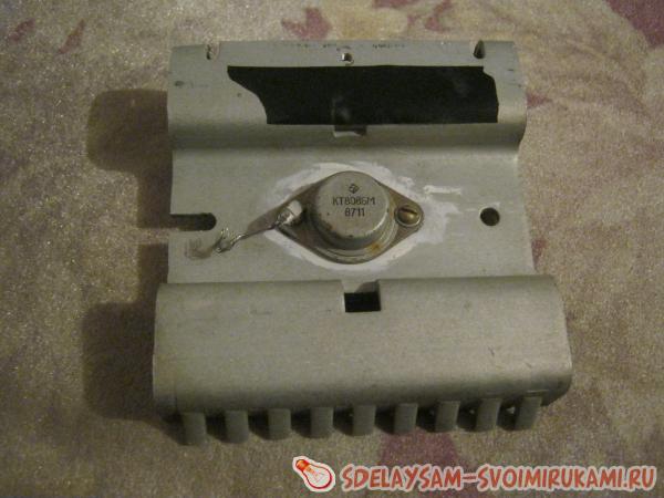 Резисторы покупаем либо выкручиваем с любых радио плат. Конденсатор тоже можете вытащить с плат. Транзистор можно так же выкрутить с платы – они обычно укреплены на радиаторах. Обратите внимание на то, чтобы транзистор был имел р-n-р переход, если будет n-p-n переход – нужно поменять коллектор и эмиттер местами подключения. Что можно сказать о радиаторе, то он должен быть большим, а если у вас нету большого радиатора, то установите на малый радиатор кулер. Медную проволоку достаем из любого трансформатора.
