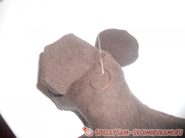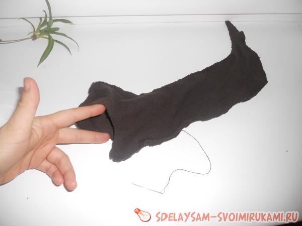 Приступаем к сшиванию ушек. Для этого берём две выкройки ушей и с изнаночной стороны по краю сшиваем их. Оставляем небольшой участок несшитым, для того чтобы вывернуть уши на лицевую сторону. Выворачиваем, сшиваем несшитый участок, пришиваем к голове.