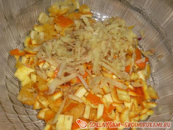 Имбирь лучше перетереть через терку. Так он придаст больше аромата. Но, можно и тоненькими кружочками порезать. Добавьте его к корочкам и перемешайте.