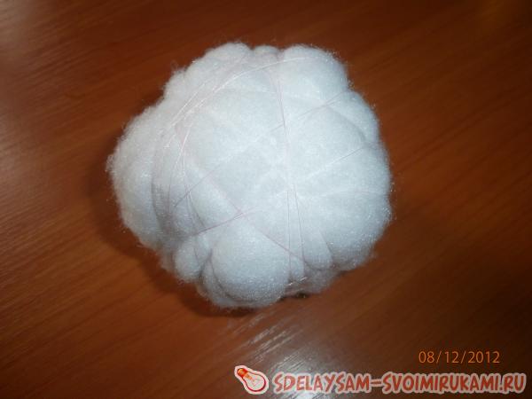 Делать снеговика будем довольно крупного размера – 30 см роста. Поэтому в целях экономии шерсти и для того, чтобы снеговик не был слишком тяжёлым, внутрь игрушки следует поместить синтепон. Делаем из синтепона шар и обматываем его нитками, чтобы он не развалился.
