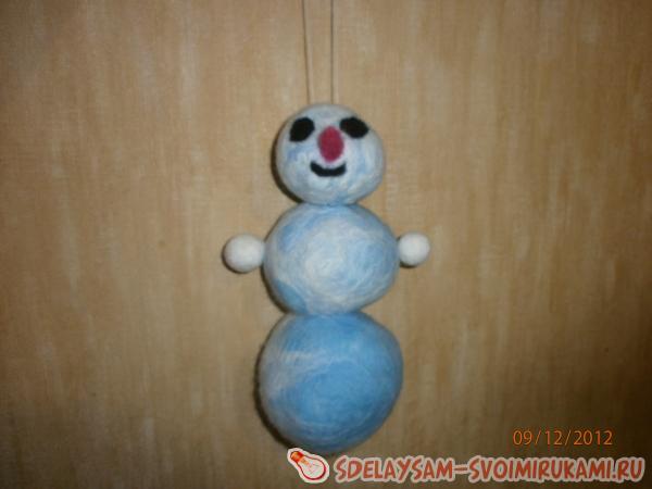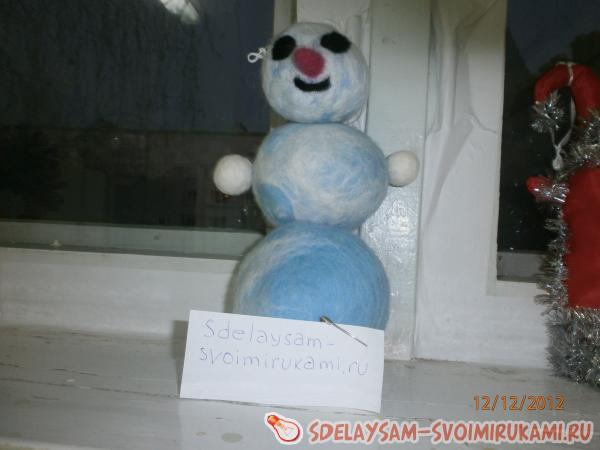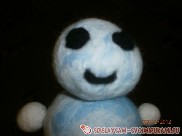 Глаза и рот «рисуем» шерстью при помощи иглы для фильцевания. Для этого нужно оторвать небольшой кусочек чёрной шерсти, распределить шерсть нужным образом и «притыкиванием» иглой прикрепляем его к голове снеговика. Фильцевать можно неограниченное время, но желательно добиться такого состояния, когда не будет видно дырочек от иглы.