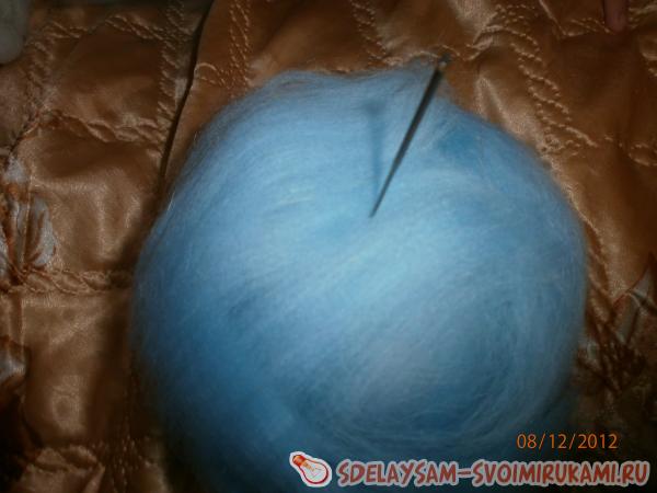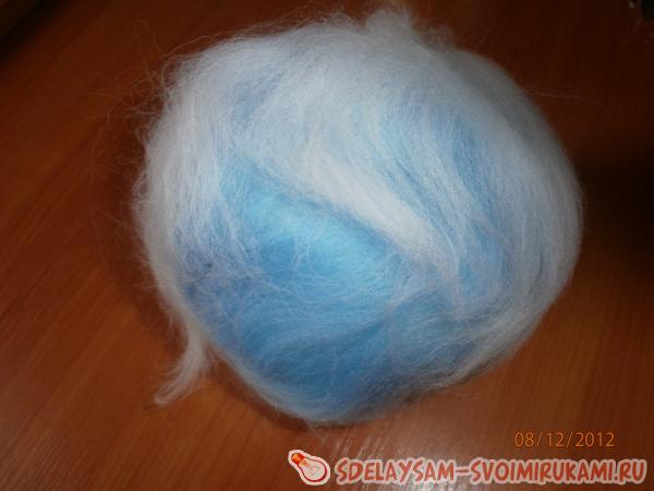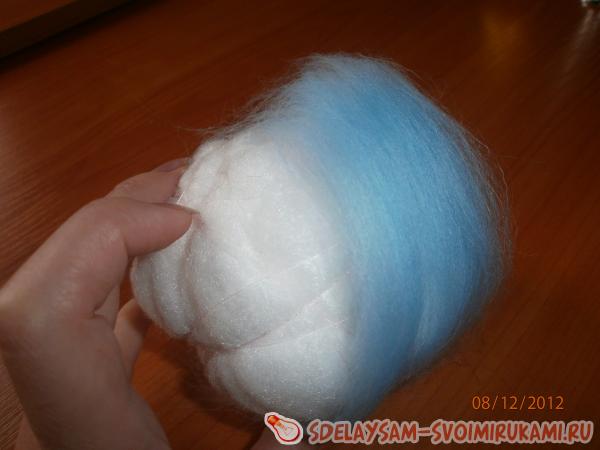 Небольшое количество белой шерсти распределяем по поверхности голубого шара, чтобы создать эффект «перламутровости», перехода одного тона в другой.