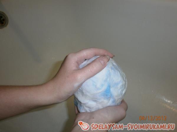 Теперь смачиваем заготовку под горячей водой и осторожно намыливаем. Сначала нужно притирать легонько, потом растирать с усилием. Тереть нужно до тех пор, пока шерсть не сваляется довольно хорошо. Можно даже иногда держать шарики под горячей водой - для лучшей усадки шерсти. Когда шарики для головы, пузика и ручек готовы - кладем их сушить.