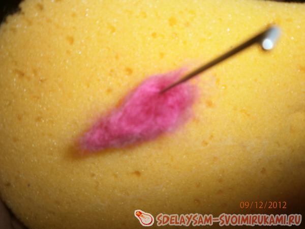 Пока заготовки будут сохнуть, нужно сделать нос – морковку. Для этого отрываем кусок оранжевой или красной шерсти, мокрыми намыленными руками скатываем деталь, придав её нужную форму. Затем размещаем «нос» на губке и продолжаем валяние уже при помощи фильцевальной иглы, катая иглой заготовку по губке и «притыкивая» её. Игла, благодаря различным насечкам, расположенным на её поверхности, позволяем «перепутывать» шерстяные волокна. Изменяя наклон «укола», силу и его глубину, добивается придание нужной формы детали.