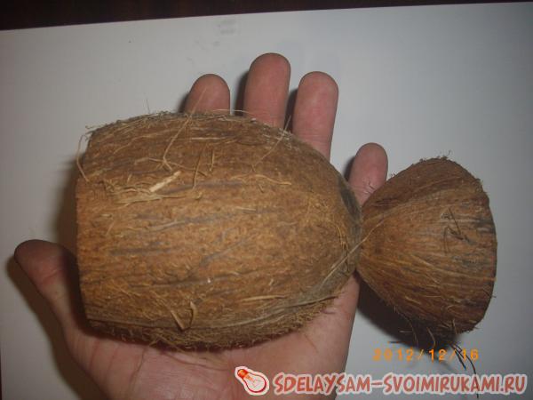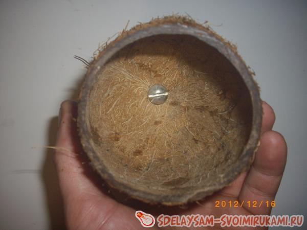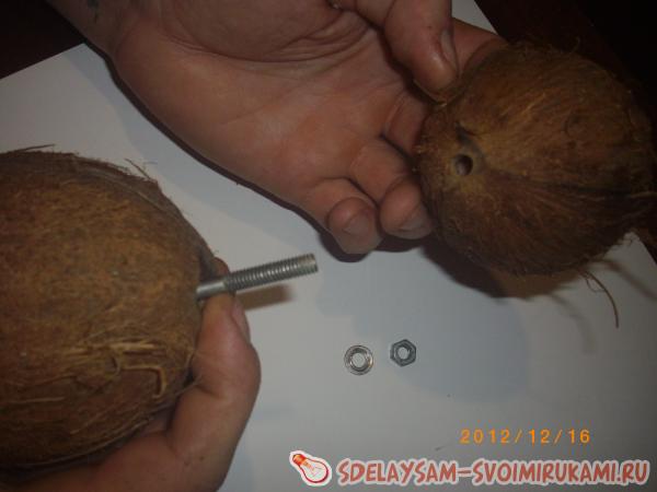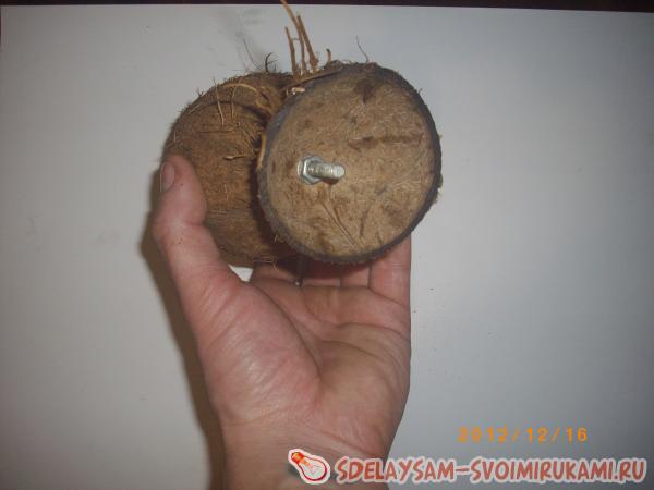Берем болт, одеваем одну из шайб и вставляем в отверстие внутри большей части кокоса.